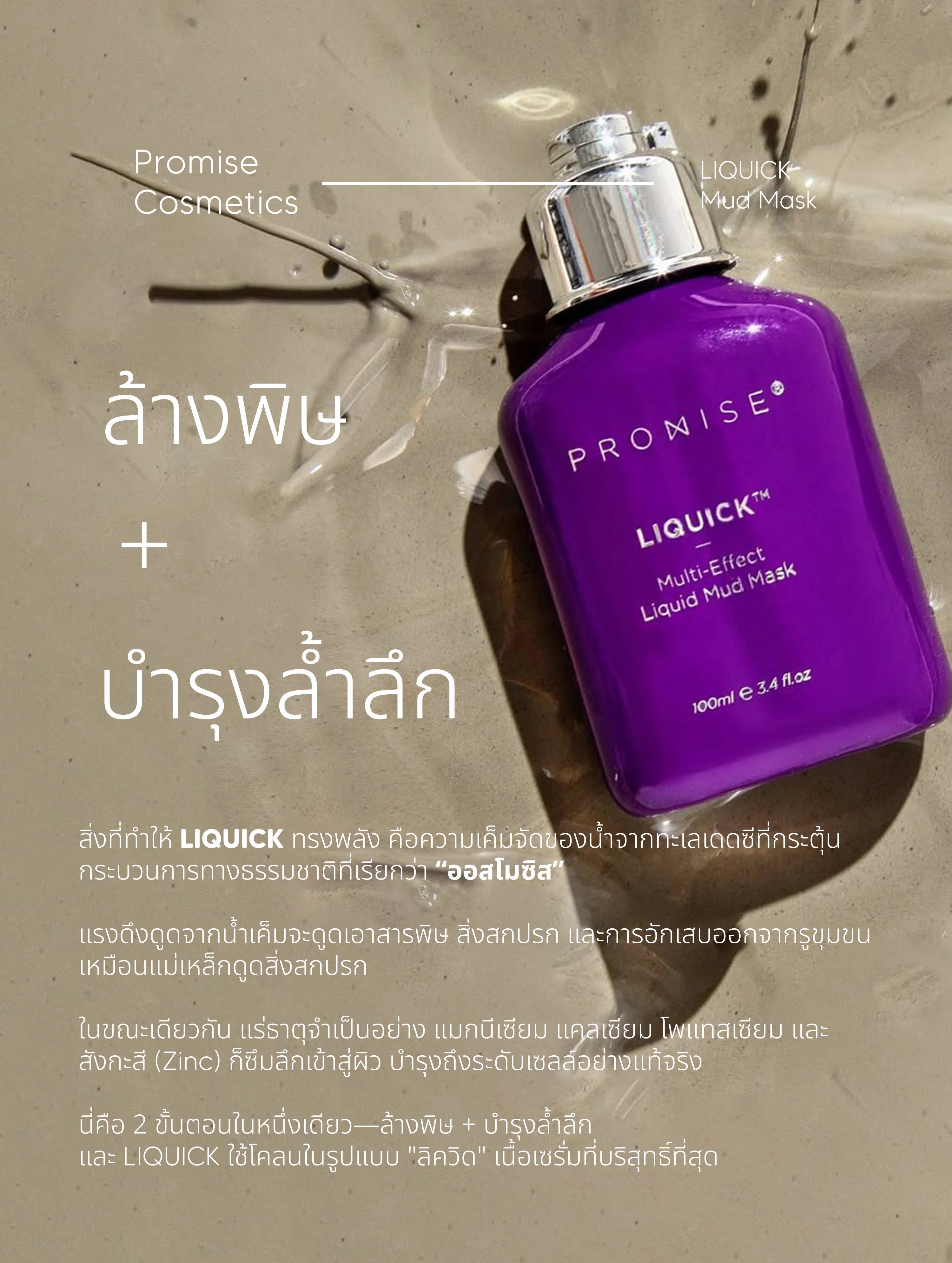 หัวใจของ LIQUICK คือโคลนดำบริสุทธิ์จากทะเลเดดซี 82% — สารที่มีแร่ธาตุเข้มข้นที่สุดบนโลก นี่ไม่ใช่ดินที่เติมแร่ธาตุ แต่แร่ธาตุคือตัวสูตรเอง มีแร่ธาตุกว่า 21 ชนิดที่ผิวดูดซึมได้ทันที รวมถึงแมกนีเซียม แคลเซียม โพแทสเซียม สังกะสี และสตรอนเทียมที่หาได้ยาก
